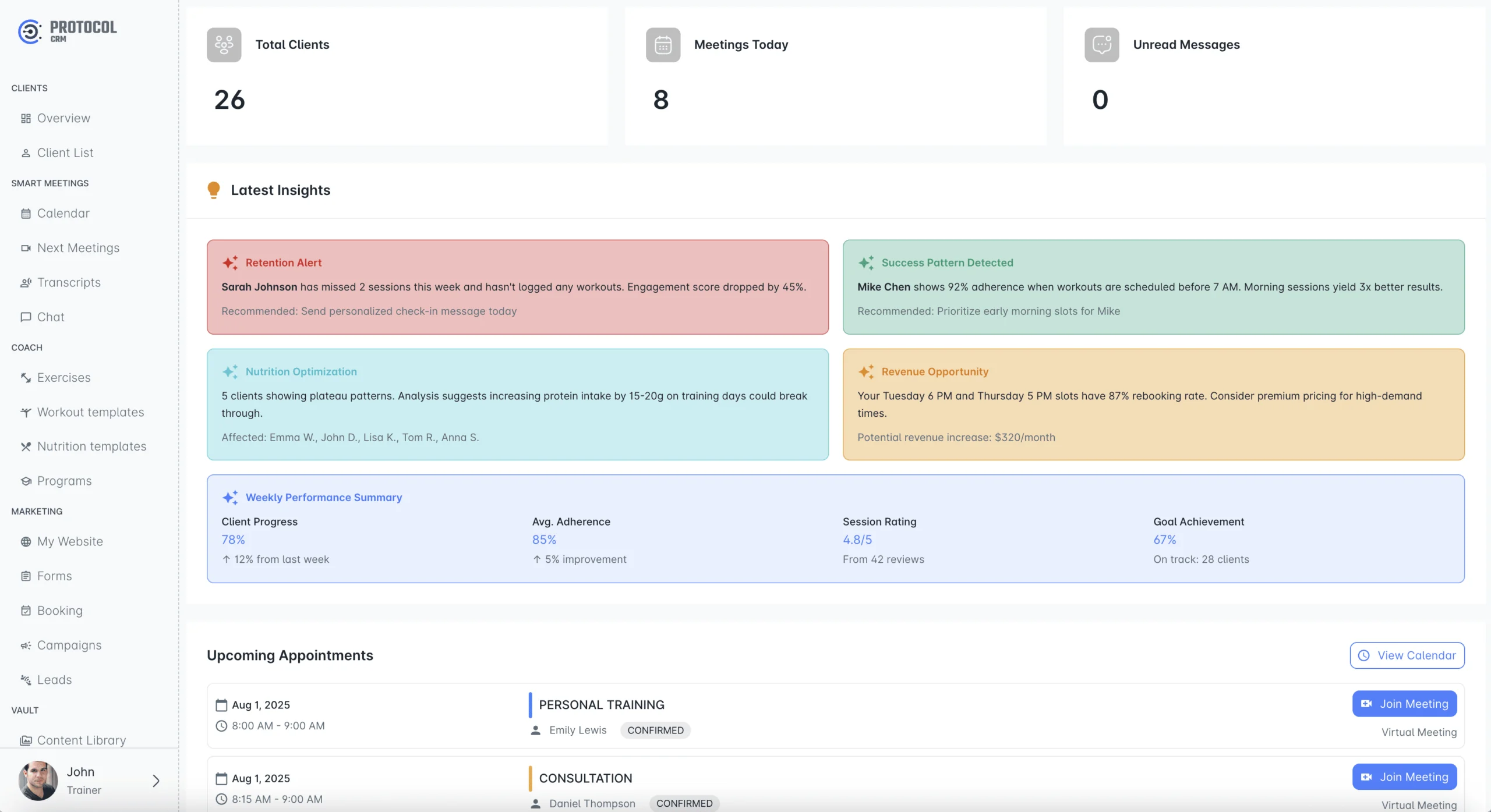 Generate personalized programs in minutes. Get meeting prep summaries. Let AI handle check-in analysis while you focus on high-value coaching.